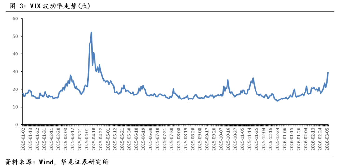 地缘对外围市场负面影响强于国内。从全球主要指数上周区间涨跌幅来看,其中上证指数跌幅最小。近期涨幅较多的韩国综合指数跌幅居前。上周全球主要指数调整,地缘扰动是主要原因,但美伊地缘冲突对全球市场的影响程度有所不同,其中近期涨幅明显,短期估值较快扩张,受地缘冲突的影响明显大于其他指数。截至3月6日,美股VIX波动率指数创出新高,表明上周美国市场对地缘影响的担忧仍没有较明显缓解。