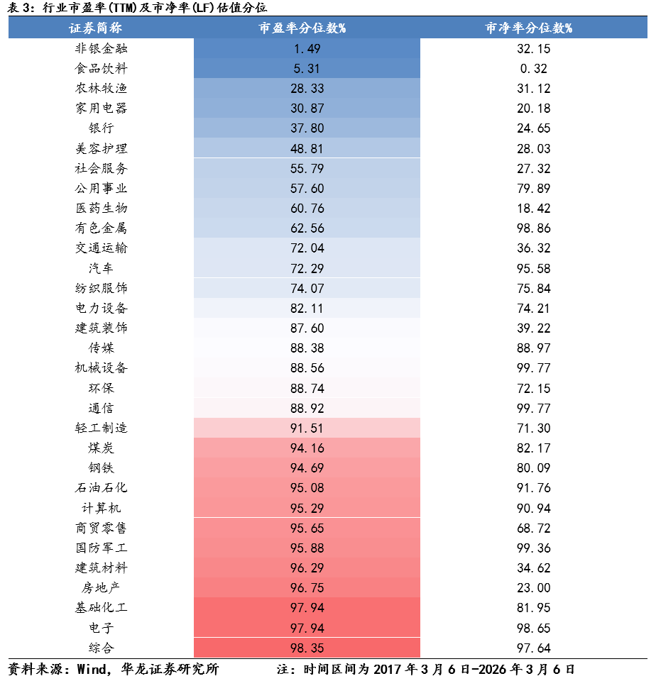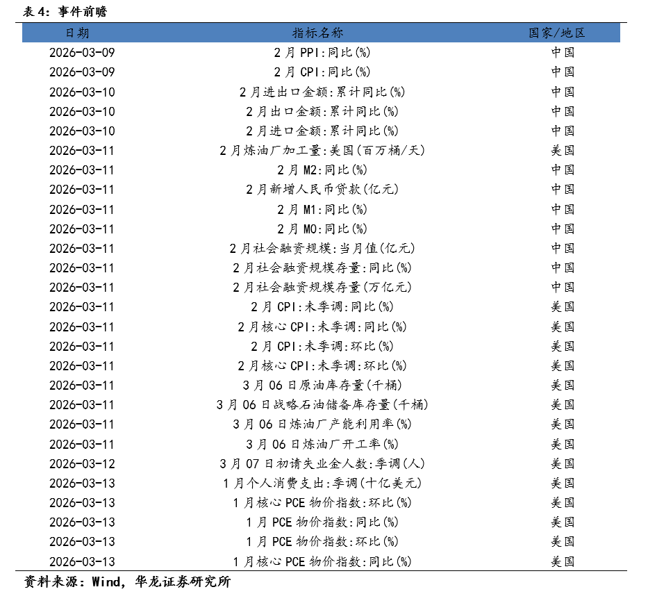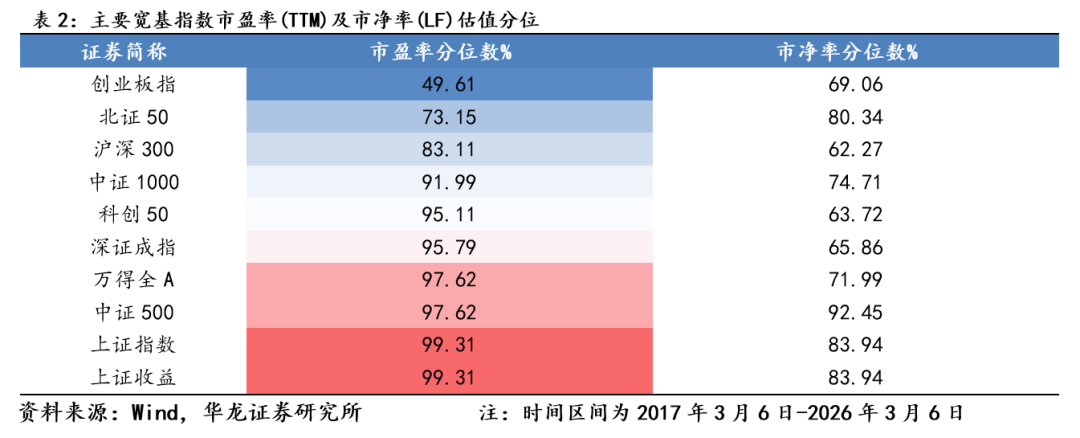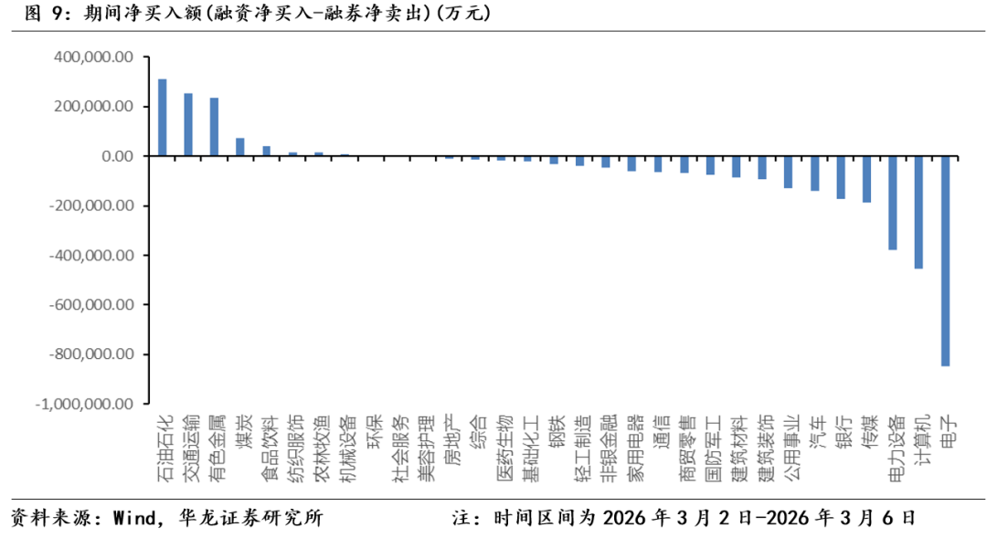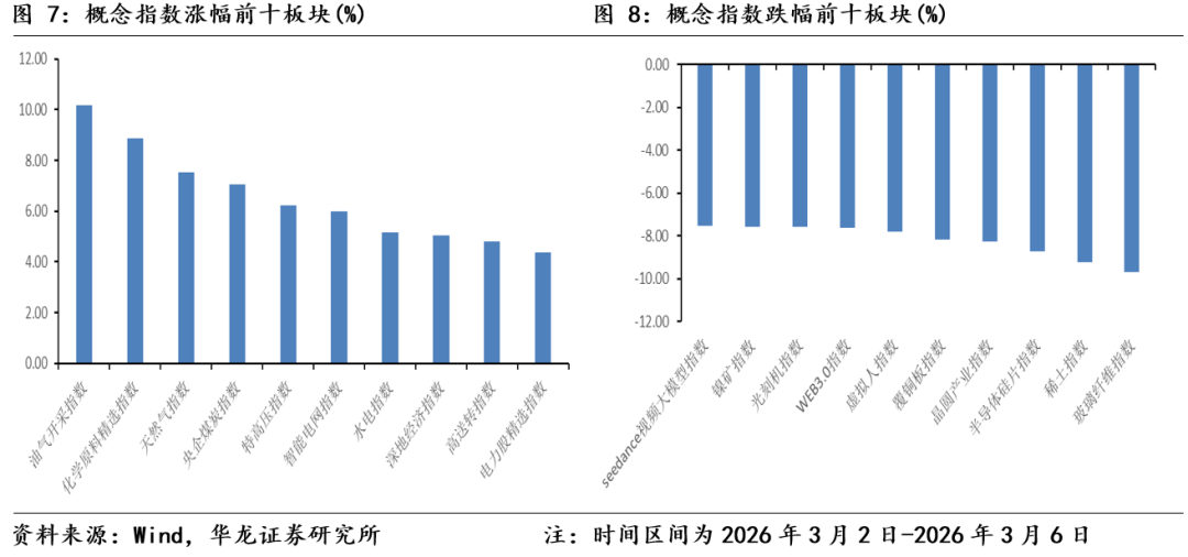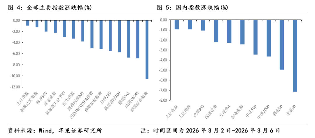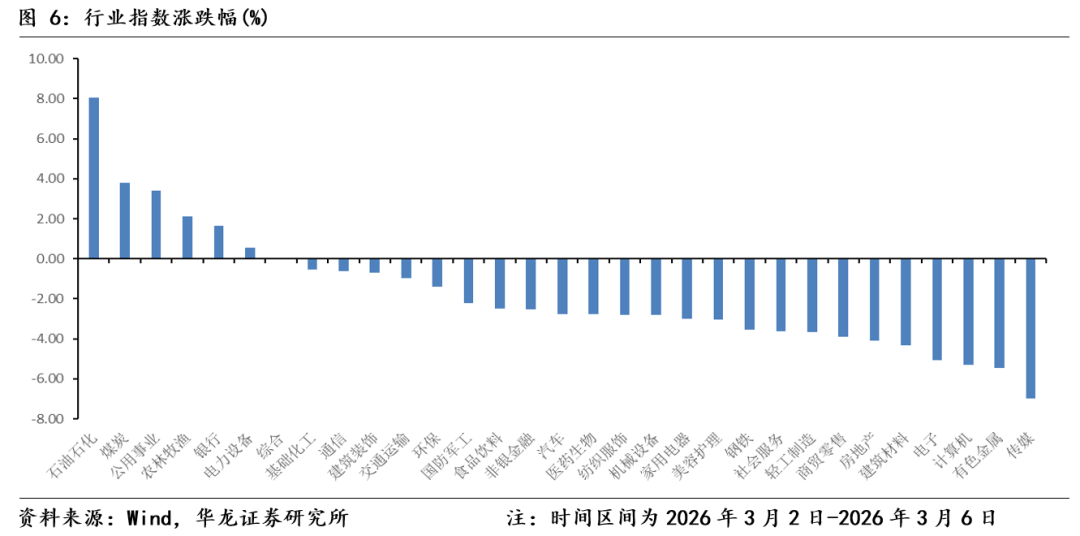 国内指数具备韧性。上周(2026年3月2日-2026年3月6日)上证指数区间涨跌幅为-0.93%、沪深 300 区间涨跌幅为-1.07%、万得全A 指数区间涨跌幅为-2.30%,主要宽基指数均调整。上周市场呈现震荡走势,主要原因是地缘冲突对市场情绪面传导影响,核心因素是地缘冲突导致短期石油、天然气等战略资源供需矛盾带来的涨价,以及全球市场对于滞涨的担忧。从上周市场表现来看,国内市场表现出较强的韧性。一方面是国内市场的估值相较于全球市场更为合理,因而受到的影响有限。另一方面“两会”召开期间,传递出的政策面积极因素对冲了市场的调整,且进一步稳定了市场对于经济基本面的预期,起到了支撑市场的作用。当前地缘冲突没有明显缓解,可能对全球市场仍会有阶段性扰动,但国内市场因估值总体合理、基本面预期稳定、流动性充裕,预计仍将继续保持韧性。