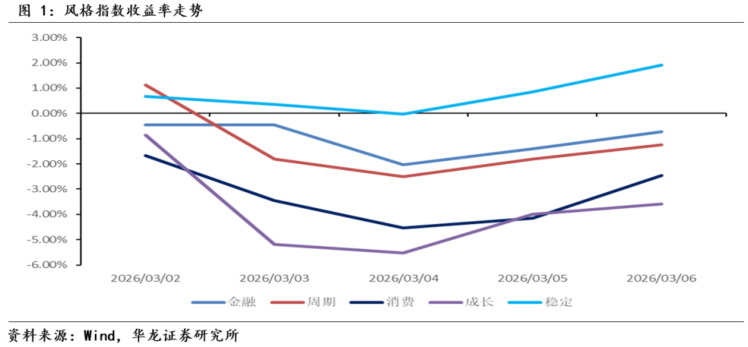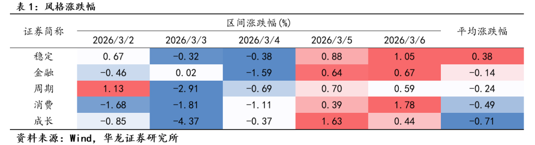 稳定、金融、周期、消费、成长等风格指数的平均区间涨跌幅分别为0.38%、-0.14%、-0.24%、-0.49%、-0.71%,上周风格指数多数下跌,其中仅稳定风格指数平均涨跌幅为正。上周市场主要受到地缘冲突扰动,风险偏好降低,情绪面倾向于谨慎,表现在成长风格在上周二调整明显,源于市场对于全球滞涨风险的担忧,以及外围市场的传导影响。周四、周五各风格指数均呈现连续上涨,主要为“两会”期间传递出的政策性因素稳定市场预期,以及美伊冲突后,情绪面影响逐步缓和。